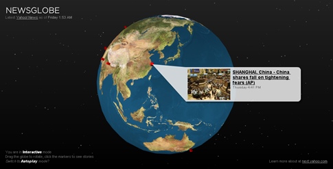 The Yahoo! NewsGlobe represents the information or breaking new in a virtual environment. It consist of basic pieces: a Yahoo! News Top Stories RSS feed, a geo-encoding web service from Yahoo! Maps, and a free, open-source library of 3D classes for ActionScript 3 called Papervision3D. The application loads the Y! News RSS feed every few minutes and extracts the dateline for each story. It sends this descriptive textual information off to the Yahoo! Maps service to find a matching location, and return latitude and longitude coordinates for it. The rest is simply a matter of using the 3D classes in ActionScript to create a visually engaging experience that's either automated or interactive.